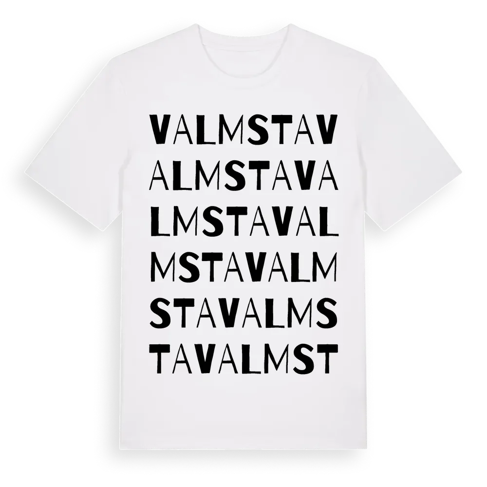Valmsta ordlek t-shirt är inspirerad av byn Valmsta i Västernorrlands län, Sverige. Tröjan är designad för dig som har en speciell koppling till platsen – oavsett om du bor här, har rötterna här eller bara älskar Valmsta.