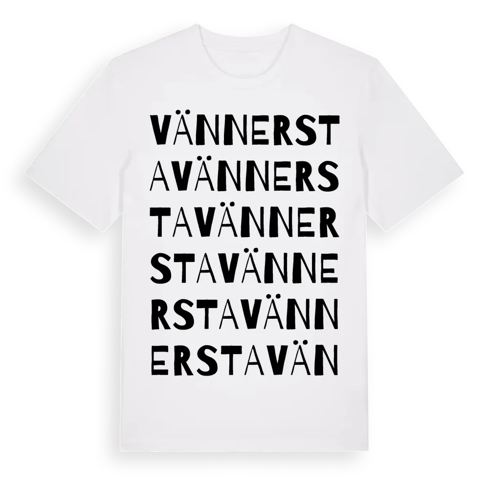 Vännersta ordlek t-shirt är inspirerad av byn Vännersta i Västernorrlands län, Sverige. Tröjan är designad för dig som har en speciell koppling till platsen – oavsett om du bor här, har rötterna här eller bara älskar Vännersta.