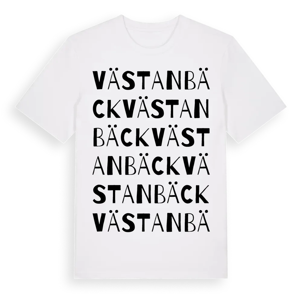 Västanbäck ordlek t-shirt är inspirerad av byn Västanbäck i Västernorrlands län, Sverige. Tröjan är designad för dig som har en speciell koppling till platsen – oavsett om du bor här, har rötterna här eller bara älskar Västanbäck.