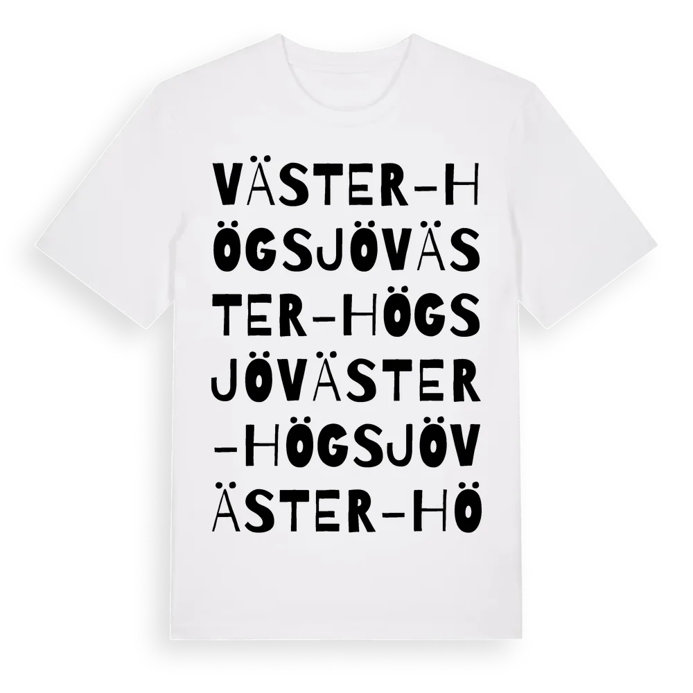 Väster-Högsjö ordlek t-shirt är inspirerad av byn Väster-Högsjö i Västernorrlands län, Sverige. Tröjan är designad för dig som har en speciell koppling till platsen – oavsett om du bor här, har rötterna här eller bara älskar Väster-Högsjö.