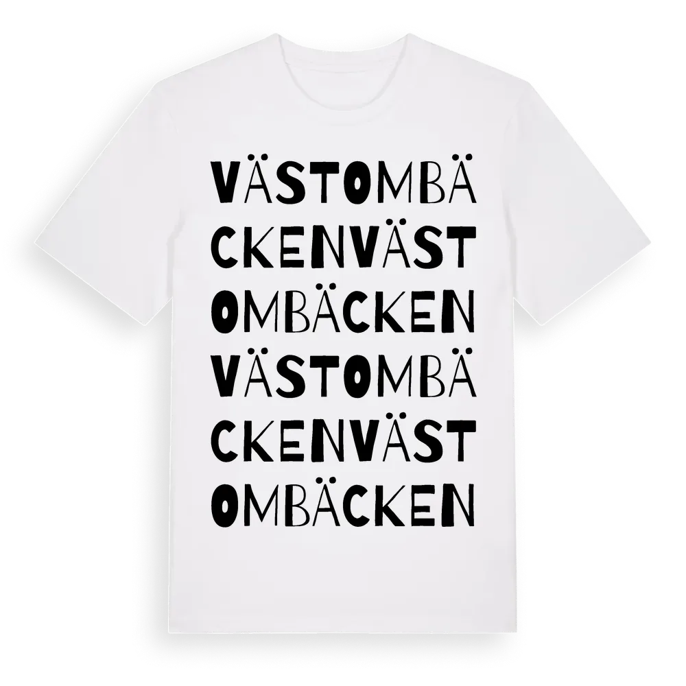 Västombäcken ordlek t-shirt är inspirerad av byn Västombäcken i Västernorrlands län, Sverige. Tröjan är designad för dig som har en speciell koppling till platsen – oavsett om du bor här, har rötterna här eller bara älskar Västombäcken.