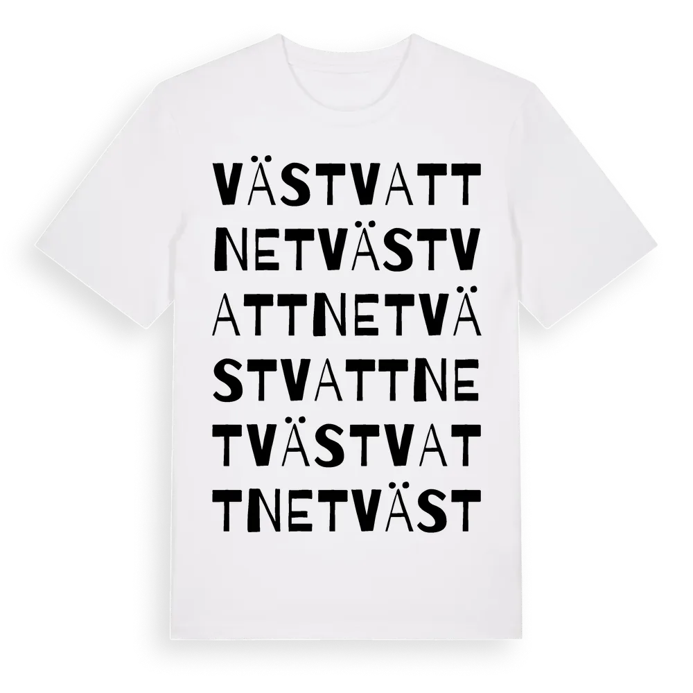Västvattnet ordlek t-shirt är inspirerad av byn Västvattnet i Västernorrlands län, Sverige. Tröjan är designad för dig som har en speciell koppling till platsen – oavsett om du bor här, har rötterna här eller bara älskar Västvattnet.