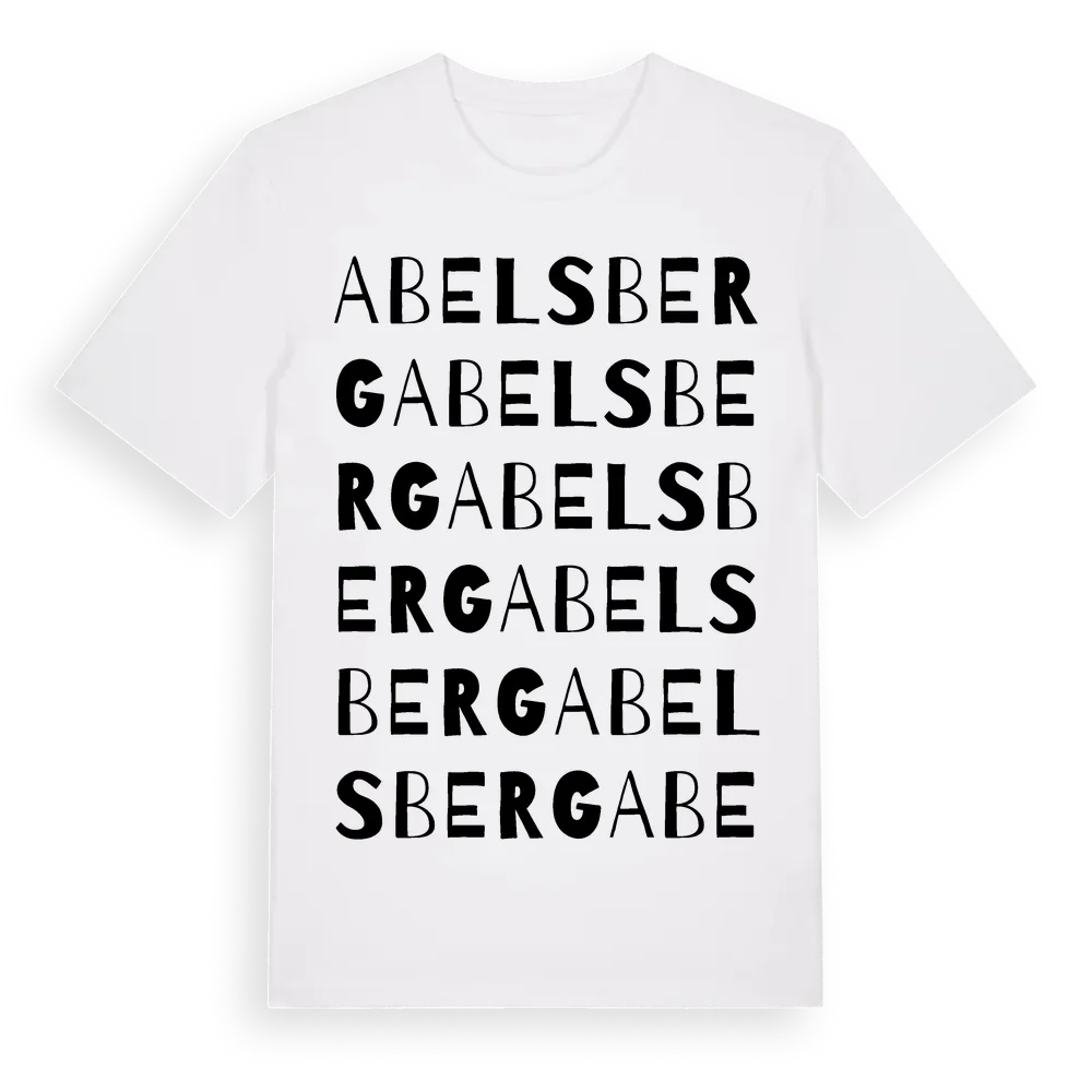 Abelsberg ordlek t-shirt är inspirerad av Abelsberg i Västmanlands län, Sverige. Tröjan är designad för dig som har en speciell koppling till platsen – oavsett om du bor här, har rötterna här eller bara älskar Abelsberg.