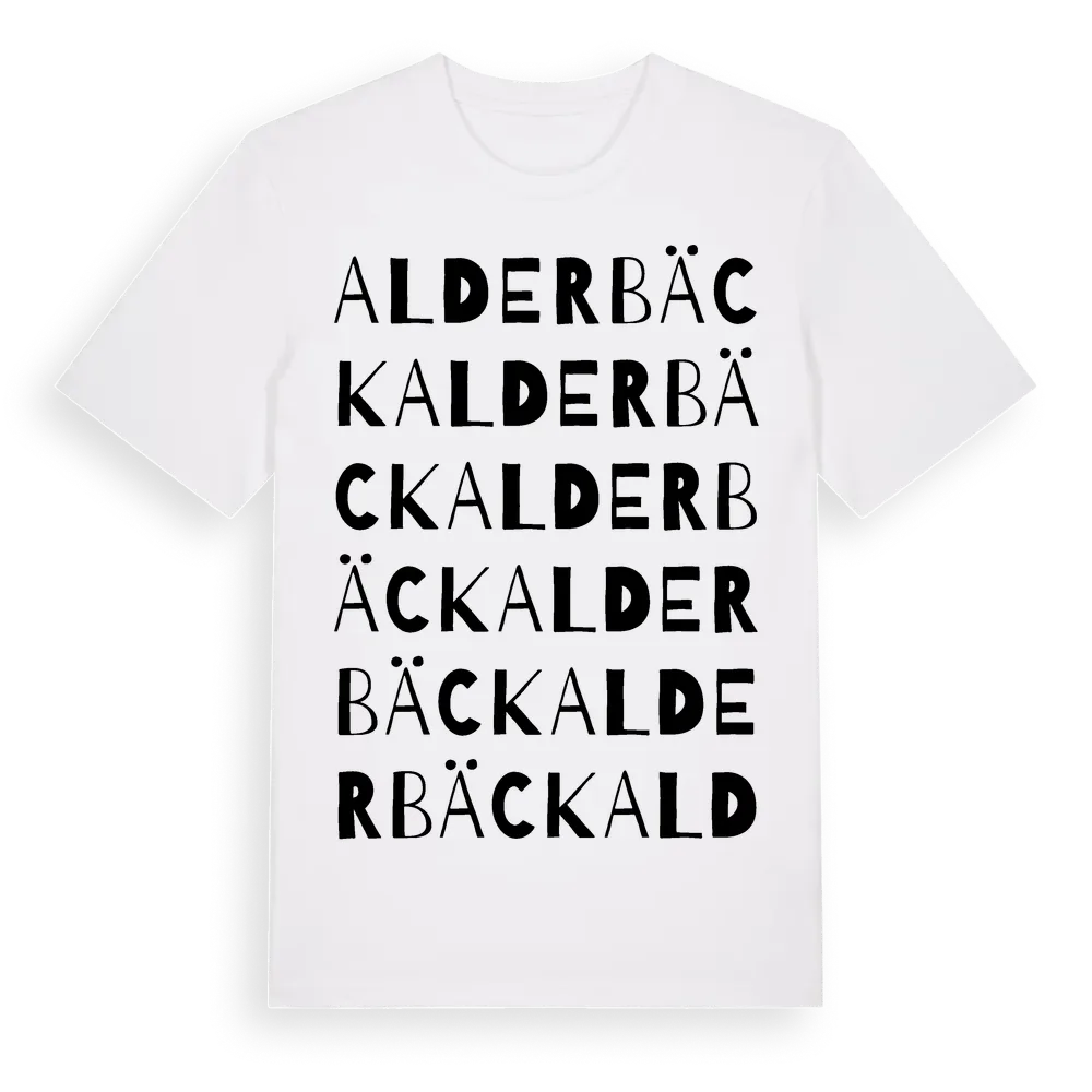Alderbäck ordlek t-shirt är inspirerad av byn Alderbäck i Västmanlands län, Sverige. Tröjan är designad för dig som har en speciell koppling till platsen – oavsett om du bor här, har rötterna här eller bara älskar Alderbäck.