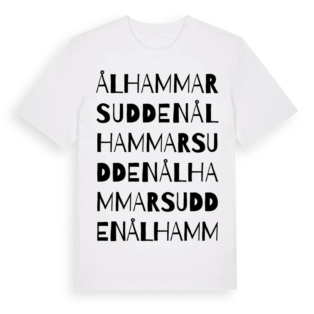 Ålhammarsudden ordlek t-shirt är inspirerad av byn Ålhammarsudden i Västmanlands län, Sverige. Tröjan är designad för dig som har en speciell koppling till platsen – oavsett om du bor här, har rötterna här eller bara älskar Ålhammarsudden.