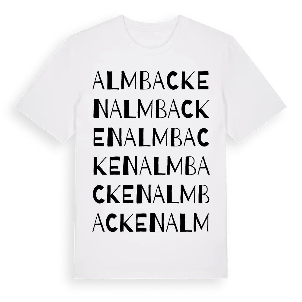 Almbacken ordlek t-shirt är inspirerad av Almbacken i Västmanlands län, Sverige. Tröjan är designad för dig som har en speciell koppling till platsen – oavsett om du bor här, har rötterna här eller bara älskar Almbacken.