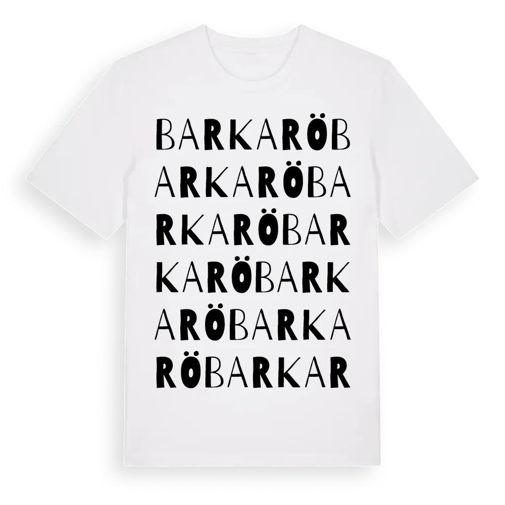 Barkarö ordlek t-shirt är inspirerad av byn Barkarö i Västmanlands län, Sverige. Tröjan är designad för dig som har en speciell koppling till platsen – oavsett om du bor här, har rötterna här eller bara älskar Barkarö.