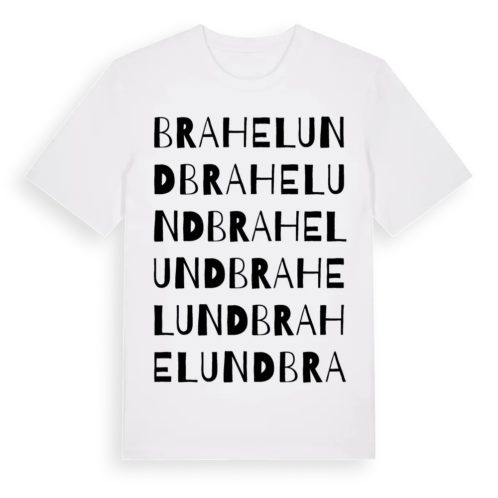 Brahelund ordlek t-shirt är inspirerad av Brahelund i Västmanlands län, Sverige. Tröjan är designad för dig som har en speciell koppling till platsen – oavsett om du bor här, har rötterna här eller bara älskar Brahelund.