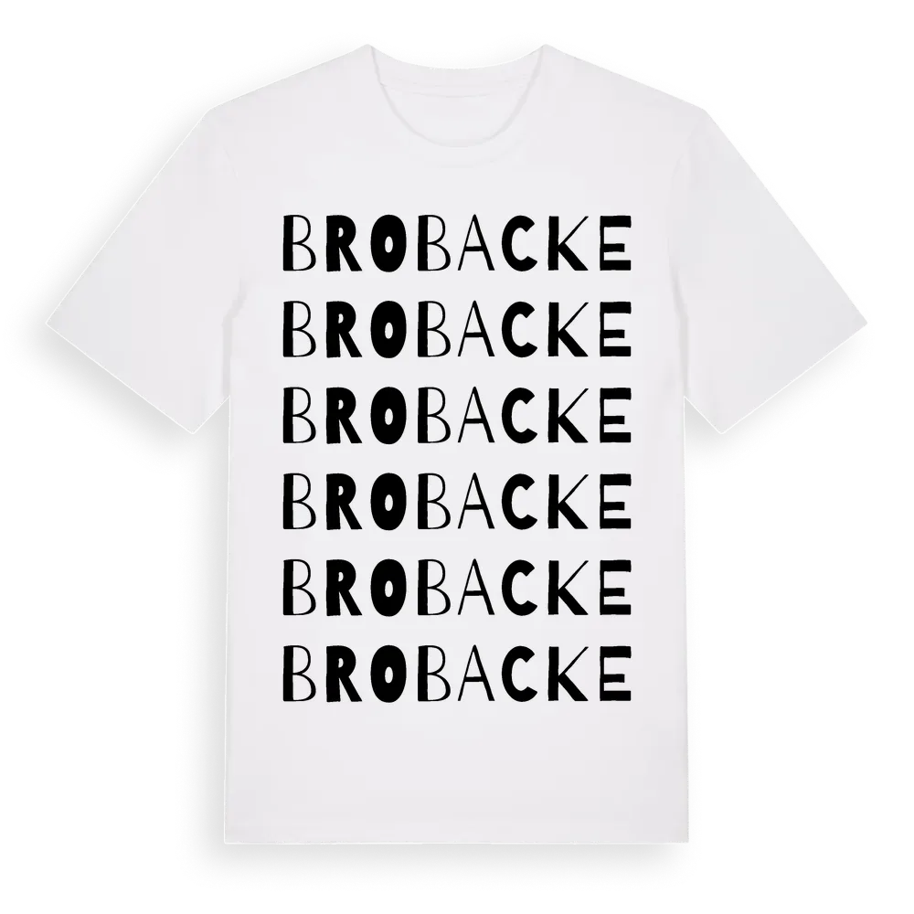 En ordlek byggd på Brobackes namn. Subtilt och klurig – ett motiv som bara de som verkligen känner platsen fullt ut förstår. Premium bomull, unisex – från byn Brobacke i Västmanlands län.