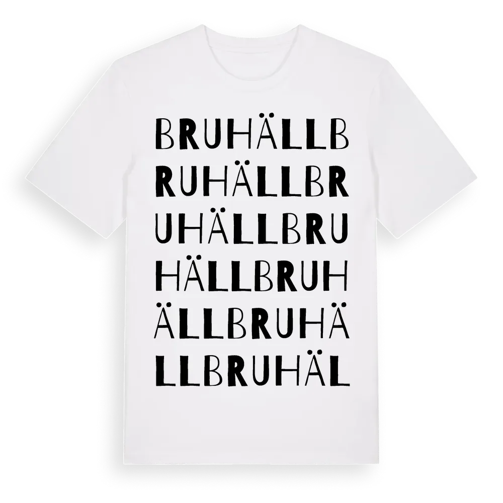 En ordlek byggd på Bruhälls namn. Subtilt och klurig – ett motiv som bara de som verkligen känner platsen fullt ut förstår. Premium bomull, unisex – från Bruhäll i Västmanlands län.