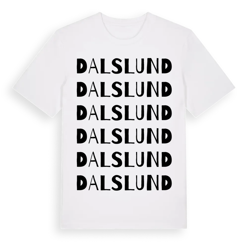 Dalslund ordlek t-shirt är inspirerad av Dalslund i Västmanlands län, Sverige. Tröjan är designad för dig som har en speciell koppling till platsen – oavsett om du bor här, har rötterna här eller bara älskar Dalslund.