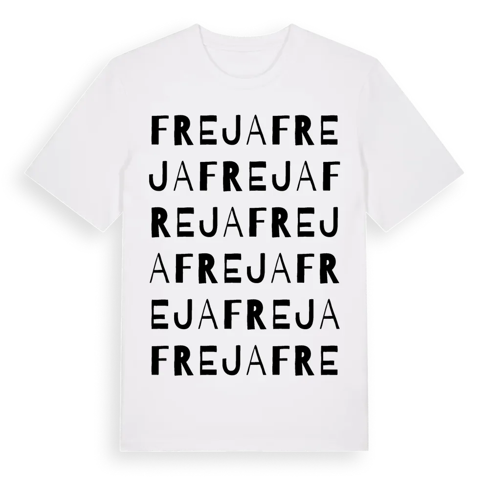 Freja ordlek t-shirt är inspirerad av stadsdelen Freja i Västmanlands län, Sverige. Tröjan är designad för dig som har en speciell koppling till platsen – oavsett om du bor här, har rötterna här eller bara älskar Freja.
