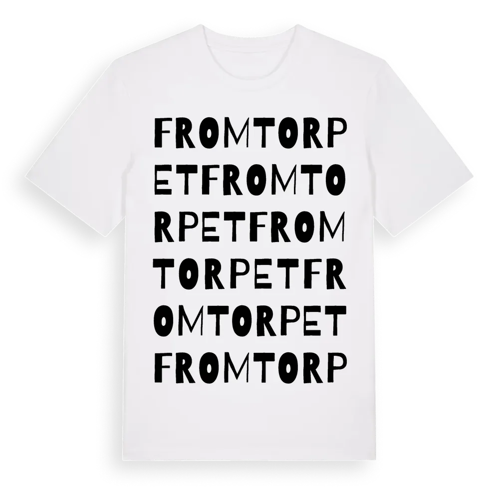 Fromtorpet ordlek t-shirt är inspirerad av Fromtorpet i Västmanlands län, Sverige. Tröjan är designad för dig som har en speciell koppling till platsen – oavsett om du bor här, har rötterna här eller bara älskar Fromtorpet.