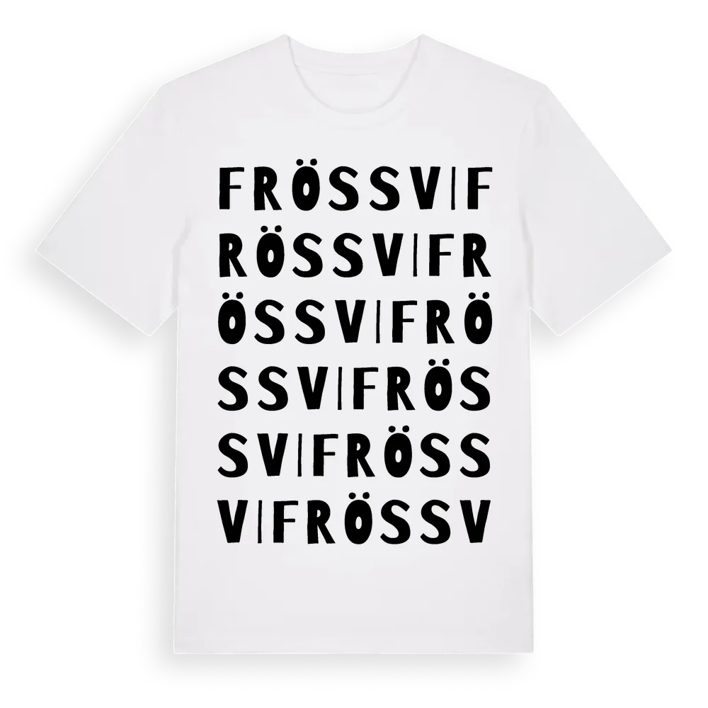 Frössvi ordlek t-shirt är inspirerad av byn Frössvi i Västmanlands län, Sverige. Tröjan är designad för dig som har en speciell koppling till platsen – oavsett om du bor här, har rötterna här eller bara älskar Frössvi.