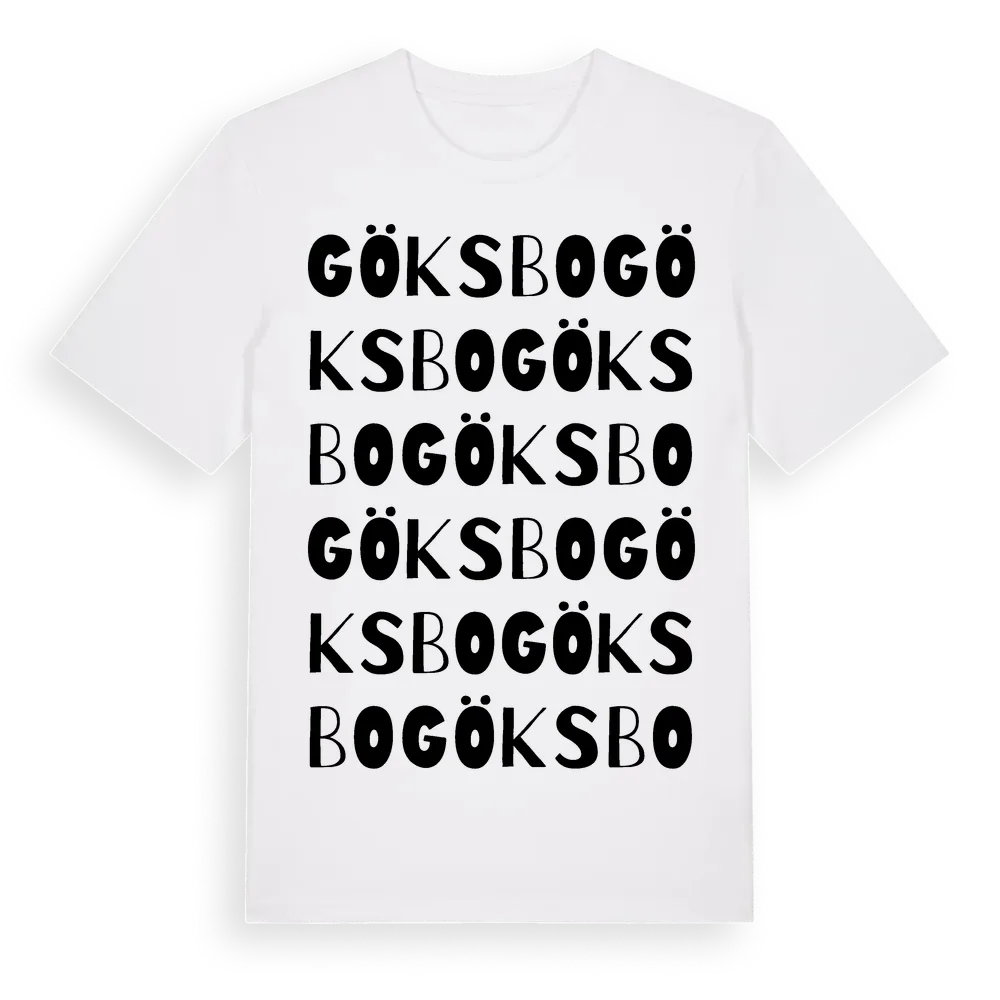 Göksbo ordlek t-shirt är inspirerad av byn Göksbo i Västmanlands län, Sverige. Tröjan är designad för dig som har en speciell koppling till platsen – oavsett om du bor här, har rötterna här eller bara älskar Göksbo.