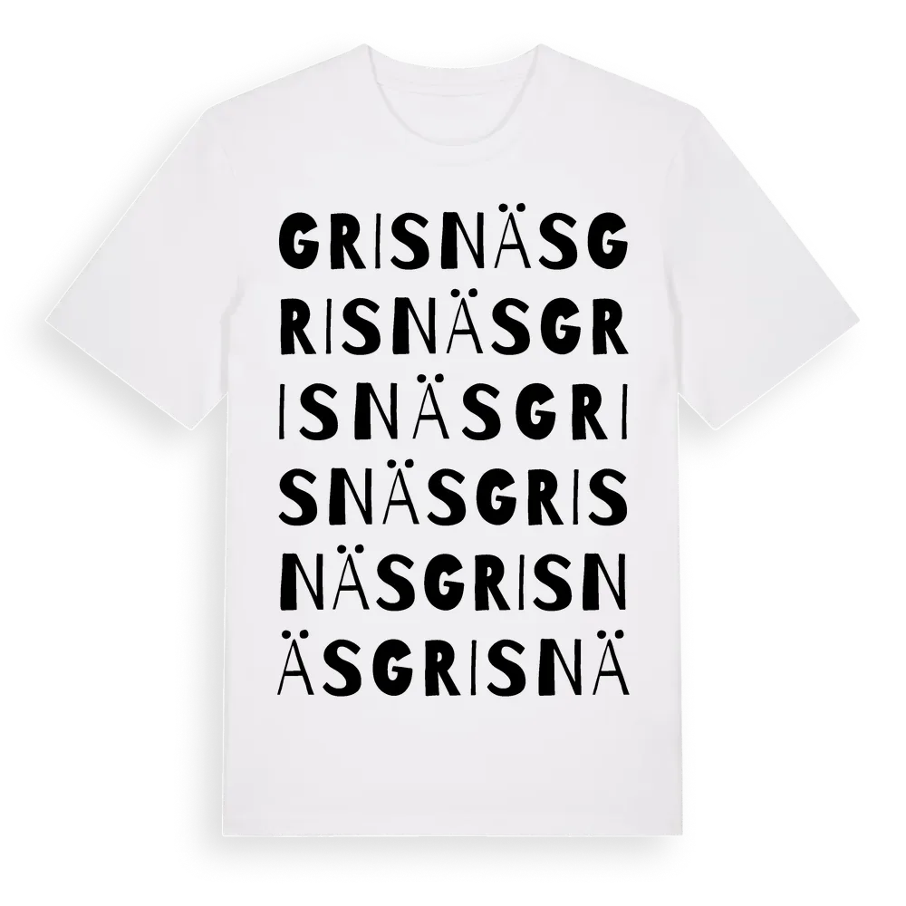 En ordlek byggd på Grisnäss namn. Subtilt och klurig – ett motiv som bara de som verkligen känner platsen fullt ut förstår. Premium bomull, unisex – från byn Grisnäs i Västmanlands län.