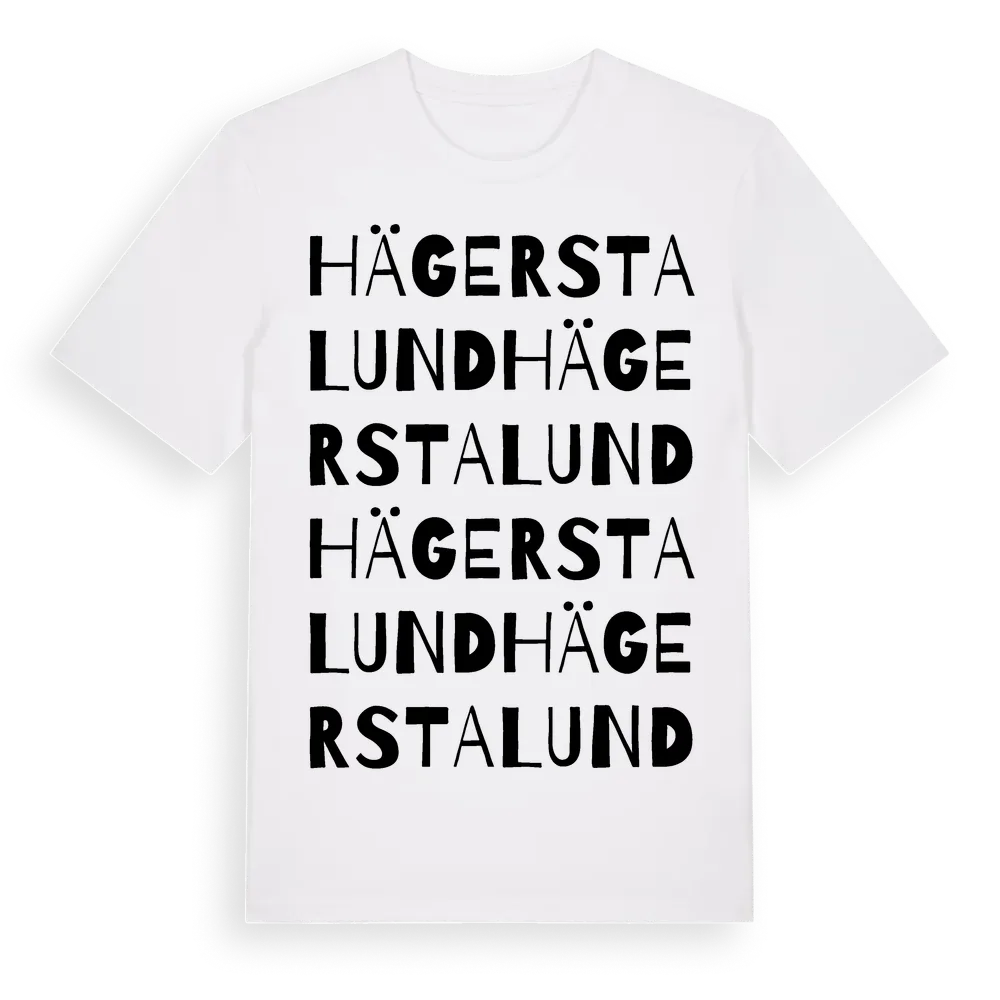 Hägerstalund ordlek t-shirt är inspirerad av Hägerstalund i Västmanlands län, Sverige. Tröjan är designad för dig som har en speciell koppling till platsen – oavsett om du bor här, har rötterna här eller bara älskar Hägerstalund.