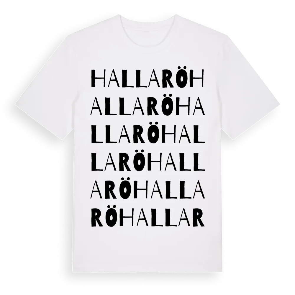 En ordlek byggd på Hallarös namn. Subtilt och klurig – ett motiv som bara de som verkligen känner platsen fullt ut förstår. Premium bomull, unisex – från byn Hallarö i Västmanlands län.