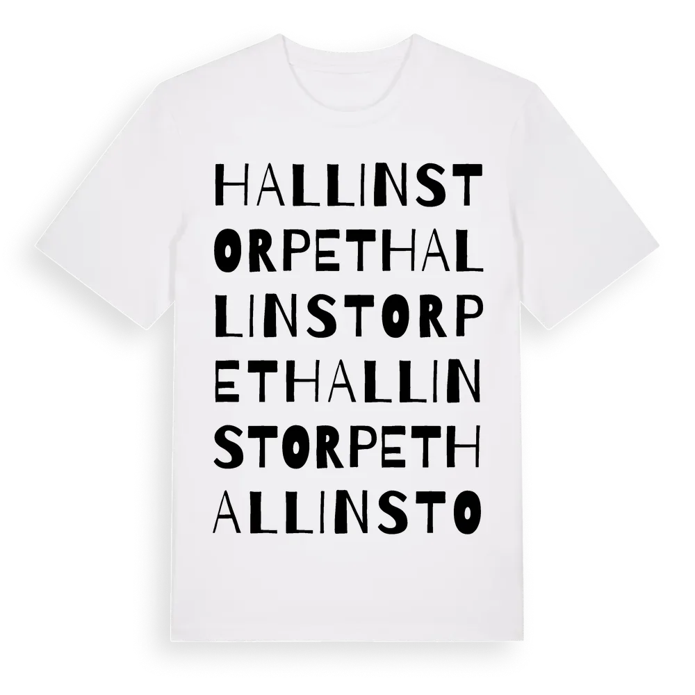 Hallinstorpet ordlek t-shirt är inspirerad av Hallinstorpet i Västmanlands län, Sverige. Tröjan är designad för dig som har en speciell koppling till platsen – oavsett om du bor här, har rötterna här eller bara älskar Hallinstorpet.