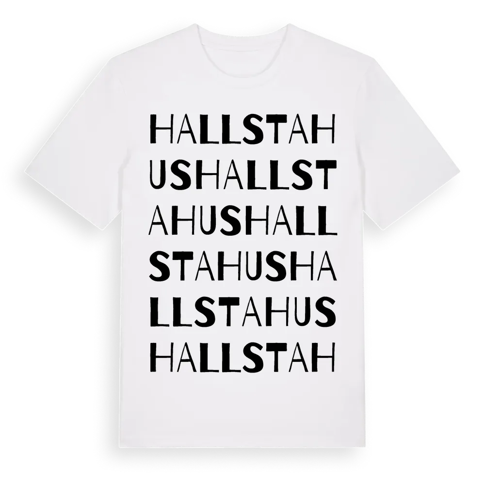 En ordlek byggd på Hallstahuss namn. Subtilt och klurig – ett motiv som bara de som verkligen känner platsen fullt ut förstår. Premium bomull, unisex – från stadsdelen Hallstahus i Västmanlands län.