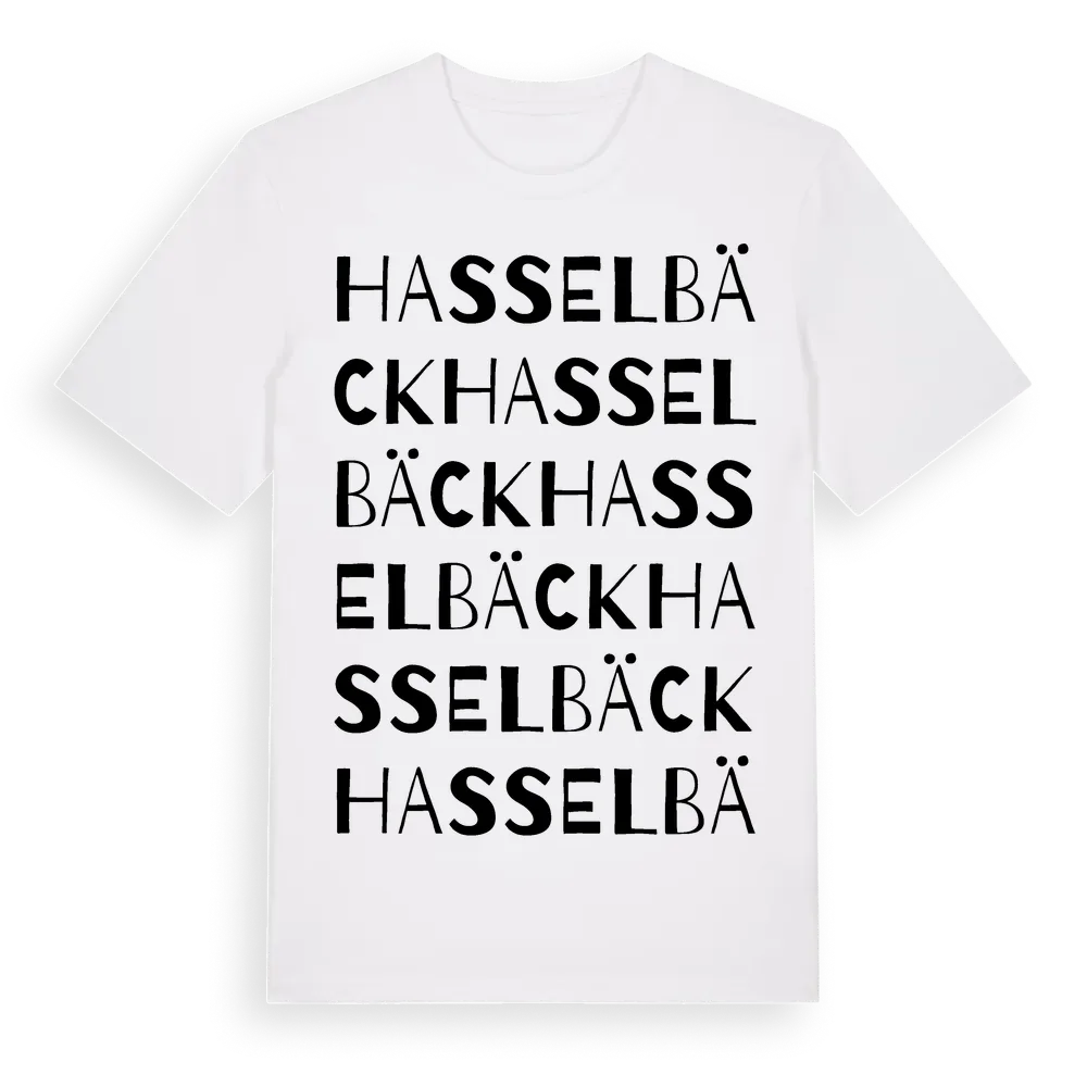 Hasselbäck ordlek t-shirt är inspirerad av byn Hasselbäck i Västmanlands län, Sverige. Tröjan är designad för dig som har en speciell koppling till platsen – oavsett om du bor här, har rötterna här eller bara älskar Hasselbäck.