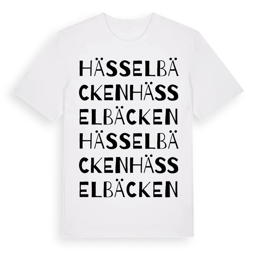 Hässelbäcken ordlek t-shirt är inspirerad av Hässelbäcken i Västmanlands län, Sverige. Tröjan är designad för dig som har en speciell koppling till platsen – oavsett om du bor här, har rötterna här eller bara älskar Hässelbäcken.
