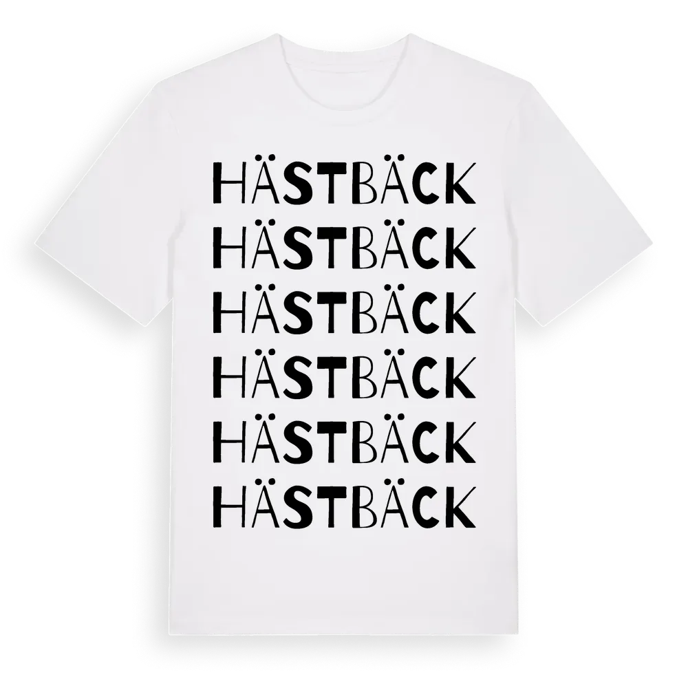 Hästbäck ordlek t-shirt är inspirerad av byn Hästbäck i Västmanlands län, Sverige. Tröjan är designad för dig som har en speciell koppling till platsen – oavsett om du bor här, har rötterna här eller bara älskar Hästbäck.