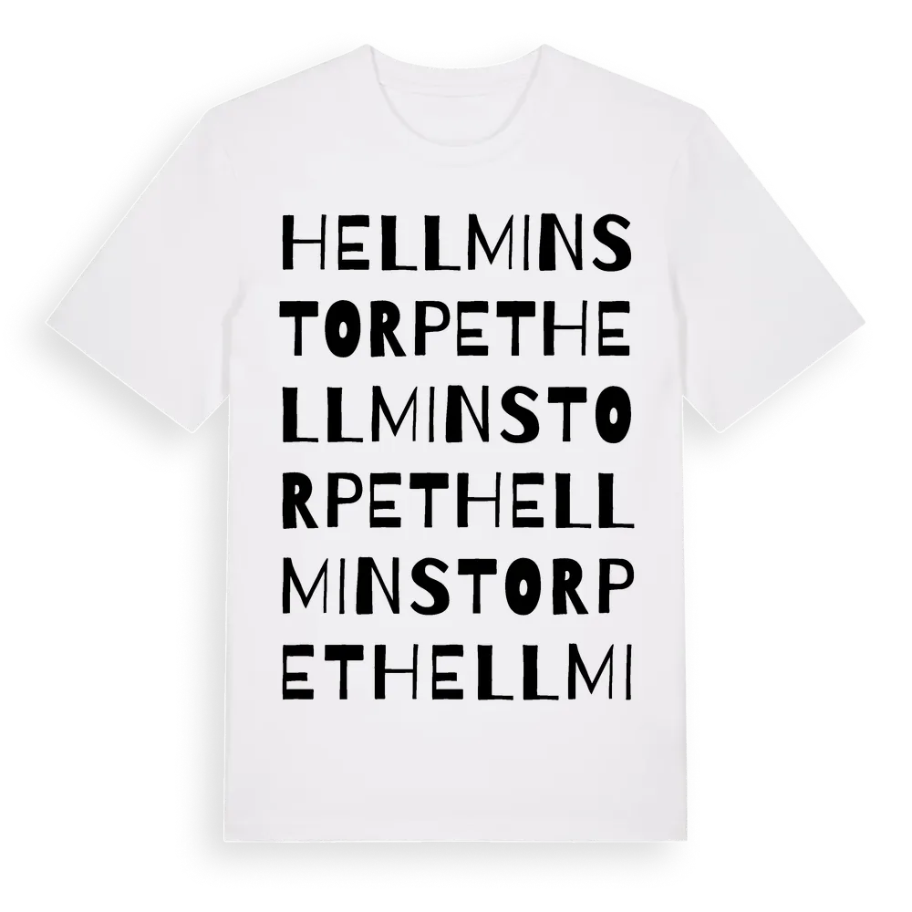 En ordlek byggd på Hellminstorpets namn. Subtilt och klurig – ett motiv som bara de som verkligen känner platsen fullt ut förstår. Premium bomull, unisex – från Hellminstorpet i Västmanlands län.