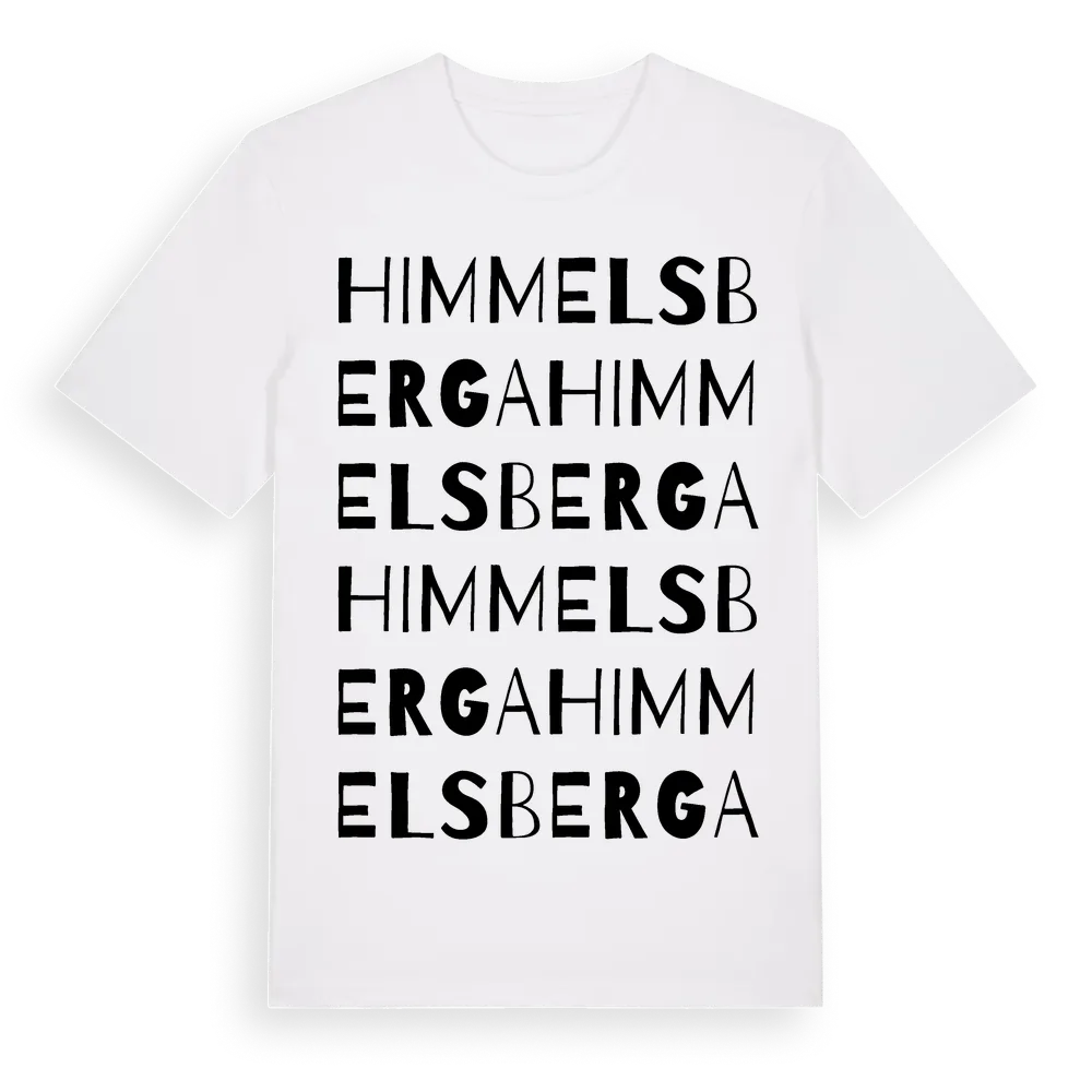 Himmelsberga ordlek t-shirt är inspirerad av byn Himmelsberga i Västmanlands län, Sverige. Tröjan är designad för dig som har en speciell koppling till platsen – oavsett om du bor här, har rötterna här eller bara älskar Himmelsberga.