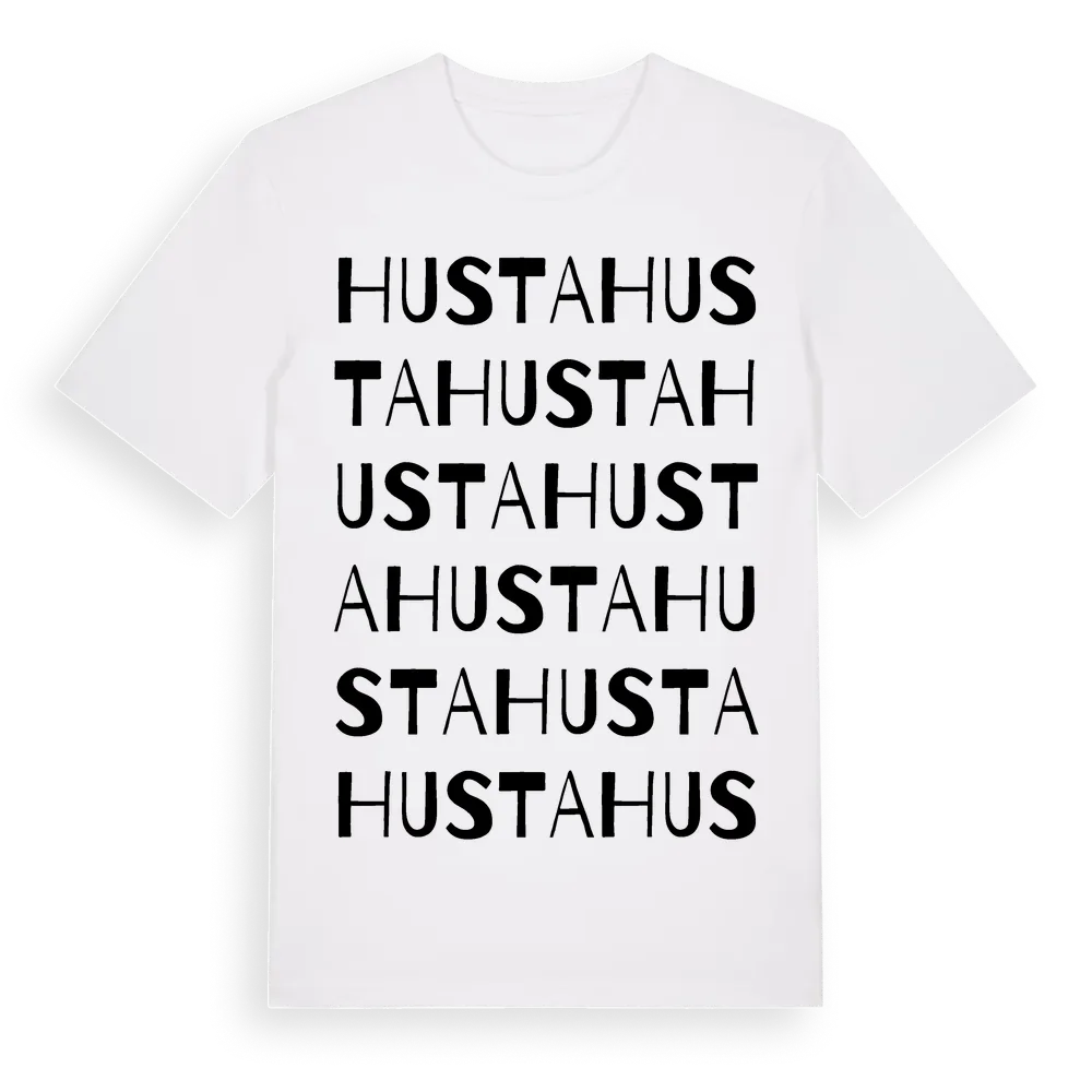 Husta ordlek t-shirt är inspirerad av byn Husta i Västmanlands län, Sverige. Tröjan är designad för dig som har en speciell koppling till platsen – oavsett om du bor här, har rötterna här eller bara älskar Husta.