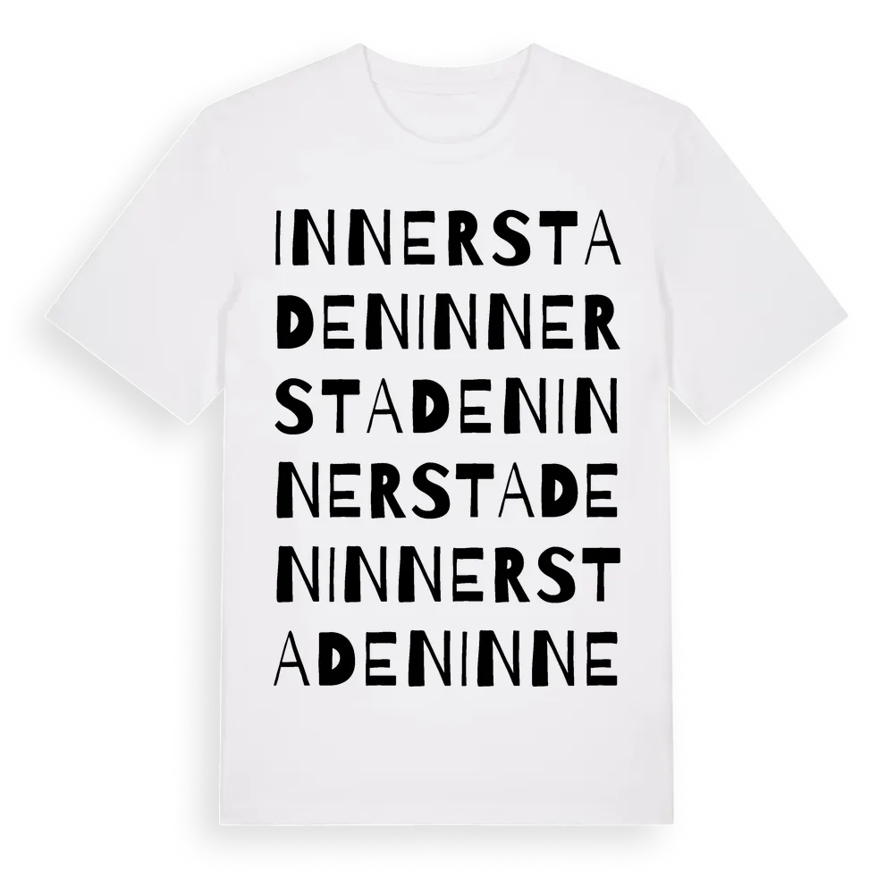 Innerstaden ordlek t-shirt är inspirerad av stadsdelen Innerstaden i Västmanlands län, Sverige. Tröjan är designad för dig som har en speciell koppling till platsen – oavsett om du bor här, har rötterna här eller bara älskar Innerstaden.