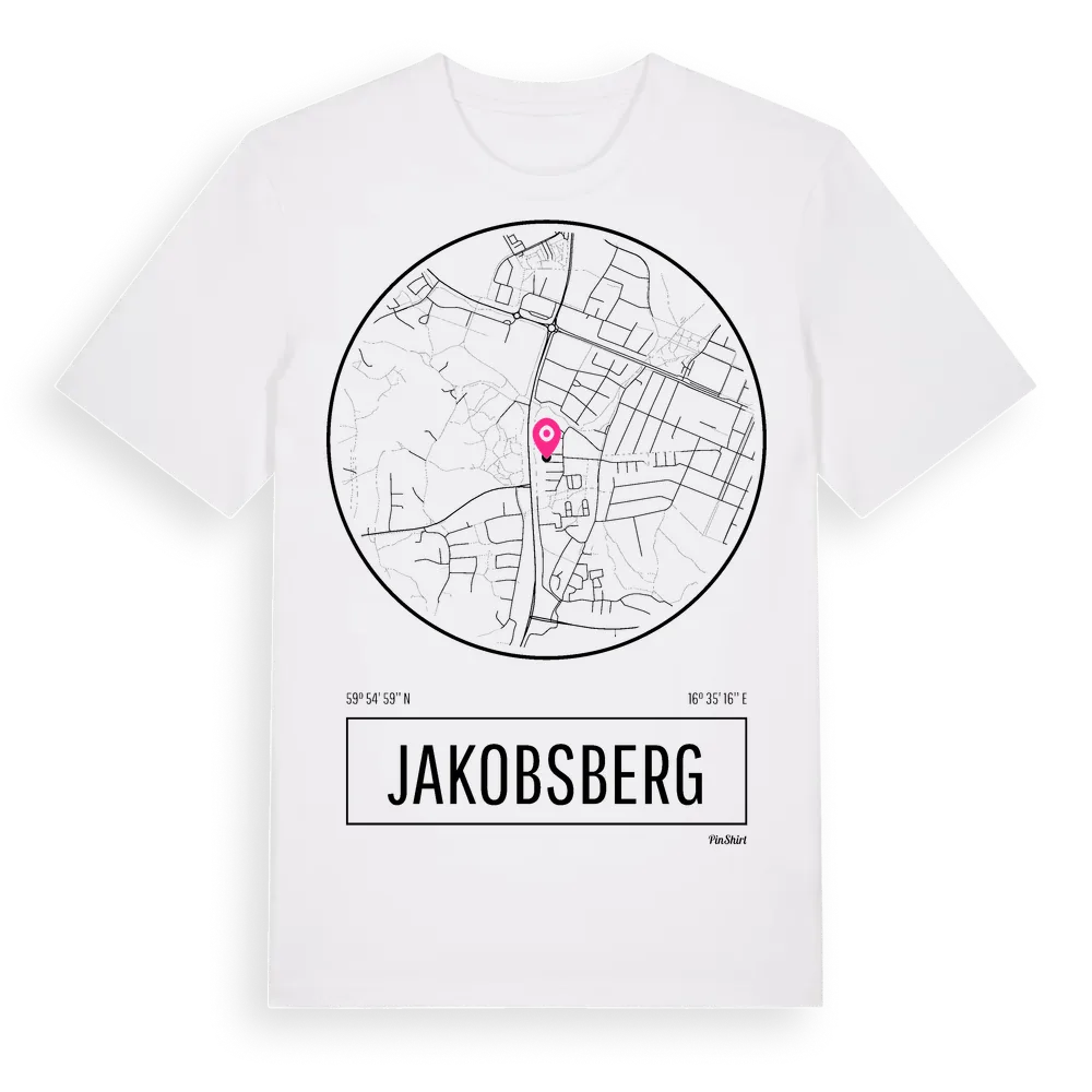 Ett rent, runt tryck med Jakobsbergs namn. Minimalistiskt och stilrent – perfekt för den som känner platsen utan att skrika det. Premium bomull, unisex – från stadsdelen Jakobsberg i Västmanlands län.