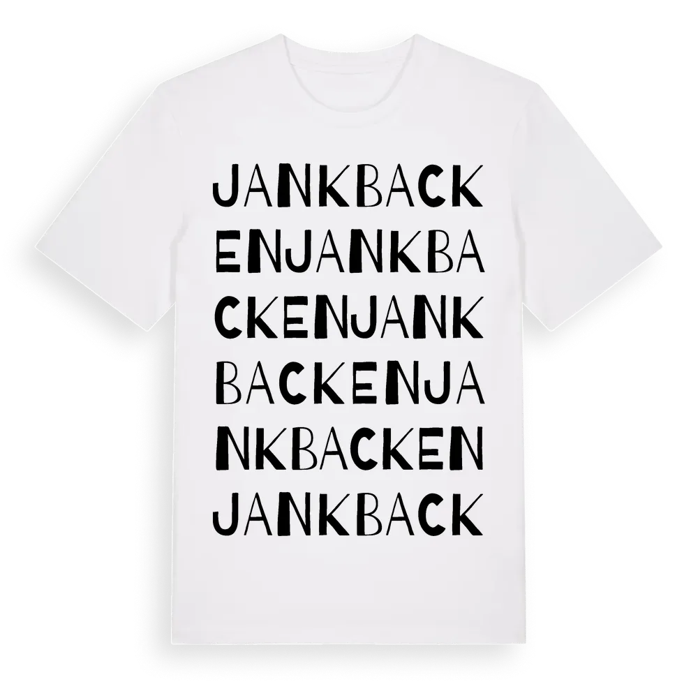 Jankbacken ordlek t-shirt är inspirerad av Jankbacken i Västmanlands län, Sverige. Tröjan är designad för dig som har en speciell koppling till platsen – oavsett om du bor här, har rötterna här eller bara älskar Jankbacken.