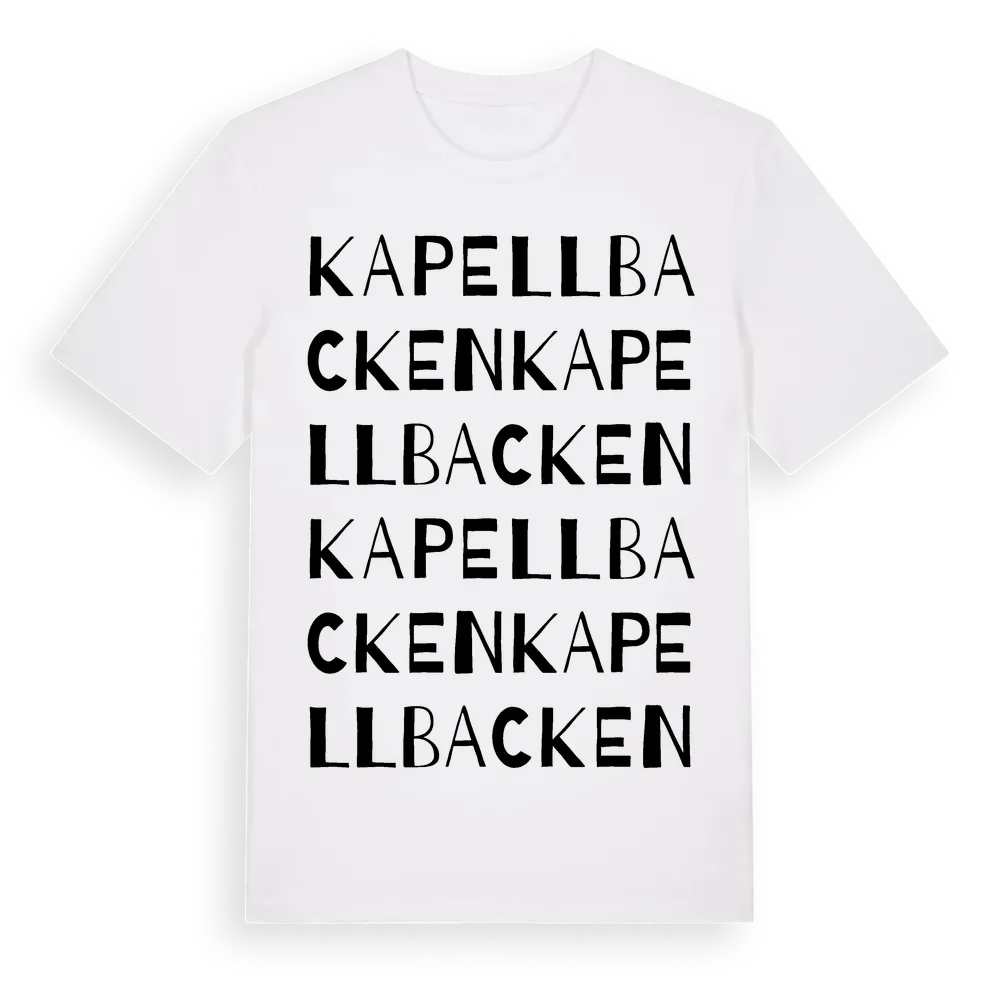 Kapellbacken ordlek t-shirt är inspirerad av Kapellbacken i Västmanlands län, Sverige. Tröjan är designad för dig som har en speciell koppling till platsen – oavsett om du bor här, har rötterna här eller bara älskar Kapellbacken.