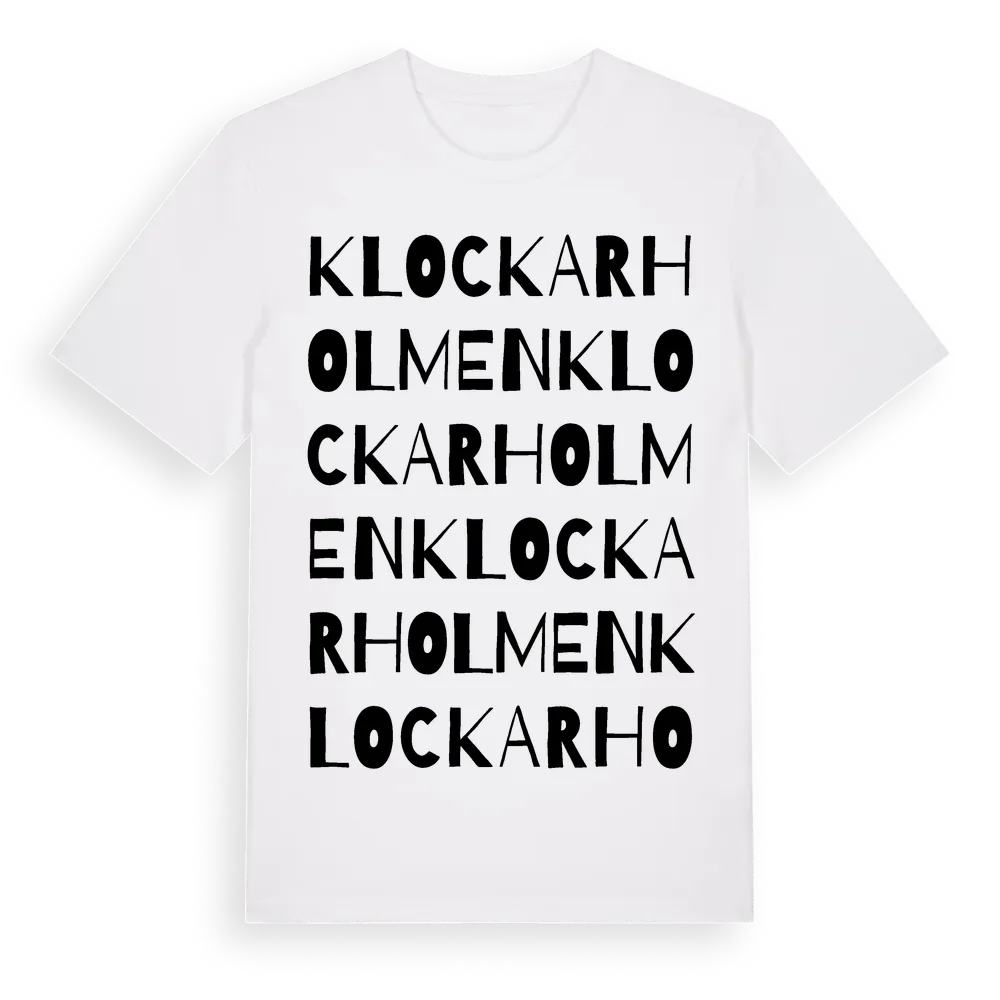 Klockarholmen ordlek t-shirt är inspirerad av Klockarholmen i Västmanlands län, Sverige. Tröjan är designad för dig som har en speciell koppling till platsen – oavsett om du bor här, har rötterna här eller bara älskar Klockarholmen.
