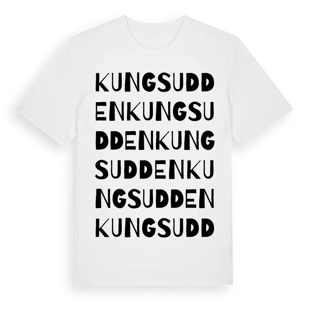 En ordlek byggd på Kungsuddens namn. Subtilt och klurig – ett motiv som bara de som verkligen känner platsen fullt ut förstår. Premium bomull, unisex – från Kungsudden i Västmanlands län.
