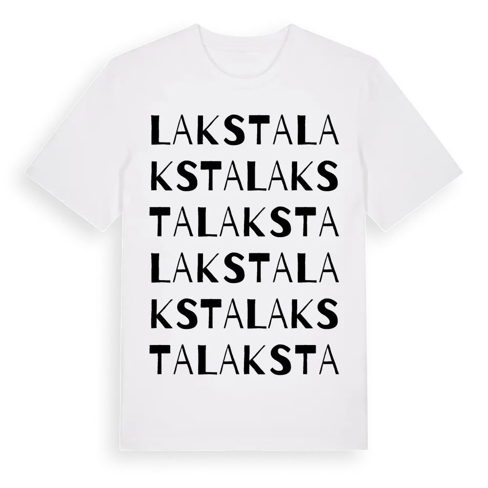 Laksta ordlek t-shirt är inspirerad av byn Laksta i Västmanlands län, Sverige. Tröjan är designad för dig som har en speciell koppling till platsen – oavsett om du bor här, har rötterna här eller bara älskar Laksta.