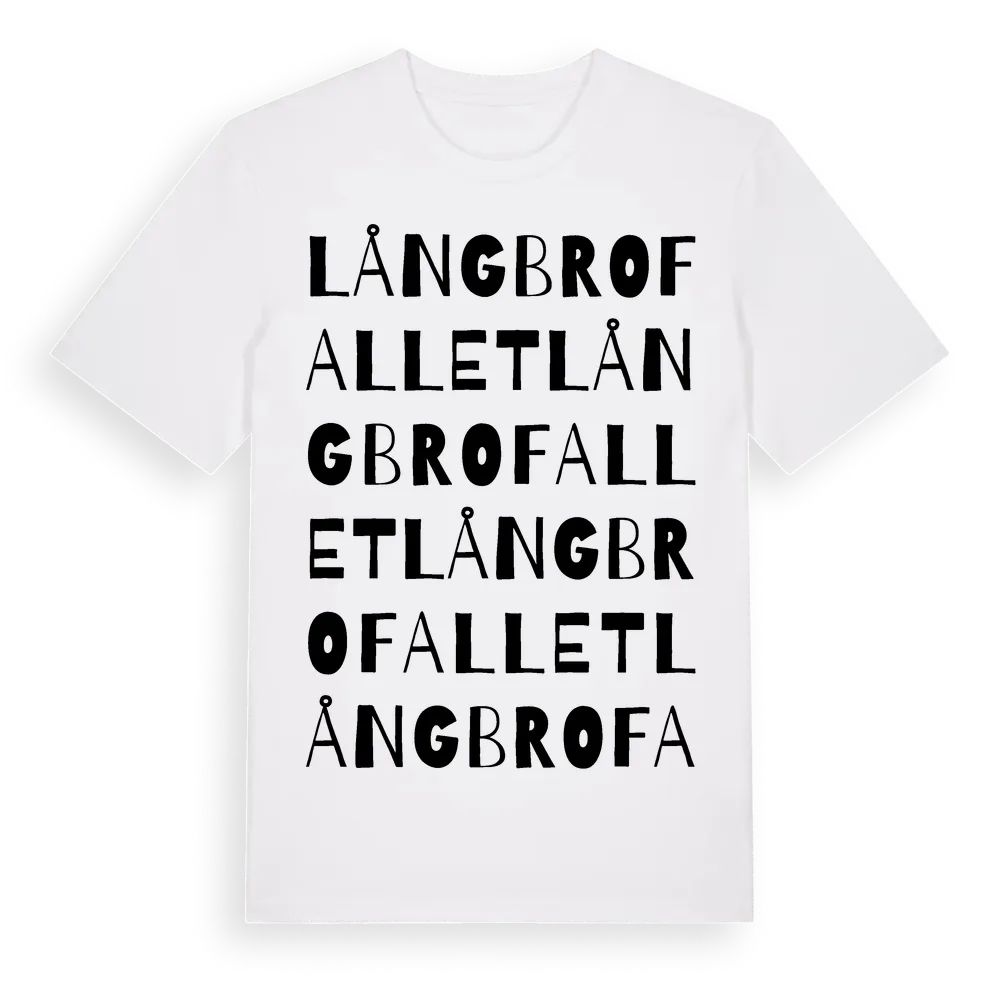 Långbrofallet ordlek t-shirt är inspirerad av Långbrofallet i Västmanlands län, Sverige. Tröjan är designad för dig som har en speciell koppling till platsen – oavsett om du bor här, har rötterna här eller bara älskar Långbrofallet.
