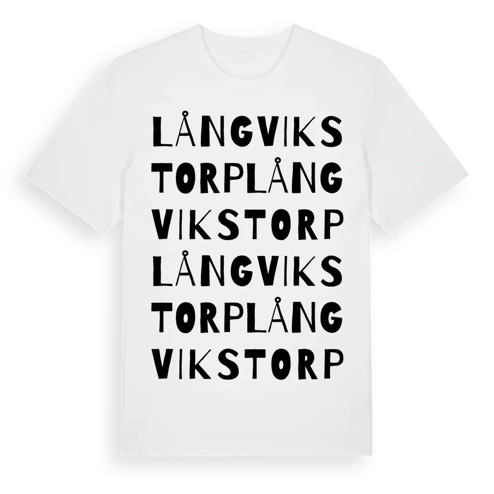 Långvikstorp ordlek t-shirt är inspirerad av stadsdelen Långvikstorp i Västmanlands län, Sverige. Tröjan är designad för dig som har en speciell koppling till platsen – oavsett om du bor här, har rötterna här eller bara älskar Långvikstorp.