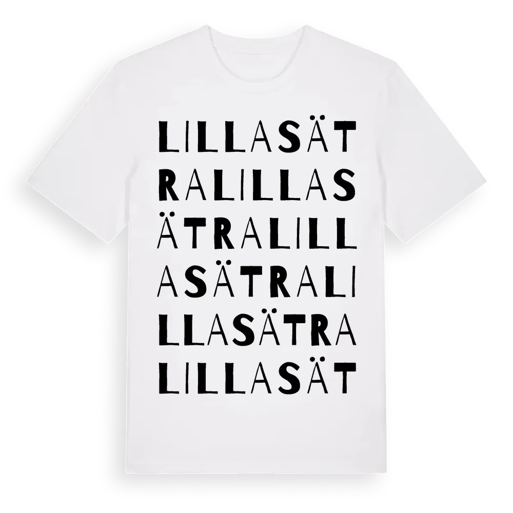 Lilla Sätra ordlek t-shirt är inspirerad av Lilla Sätra i Västmanlands län, Sverige. Tröjan är designad för dig som har en speciell koppling till platsen – oavsett om du bor här, har rötterna här eller bara älskar Lilla Sätra.