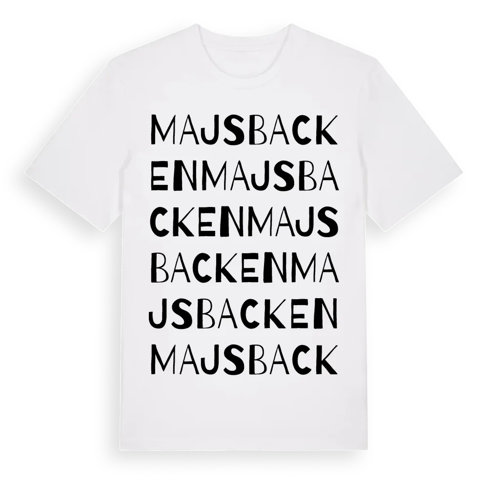 Majsbacken ordlek t-shirt är inspirerad av Majsbacken i Västmanlands län, Sverige. Tröjan är designad för dig som har en speciell koppling till platsen – oavsett om du bor här, har rötterna här eller bara älskar Majsbacken.