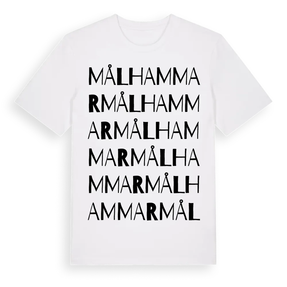 Målhammar ordlek t-shirt är inspirerad av Målhammar i Västmanlands län, Sverige. Tröjan är designad för dig som har en speciell koppling till platsen – oavsett om du bor här, har rötterna här eller bara älskar Målhammar.