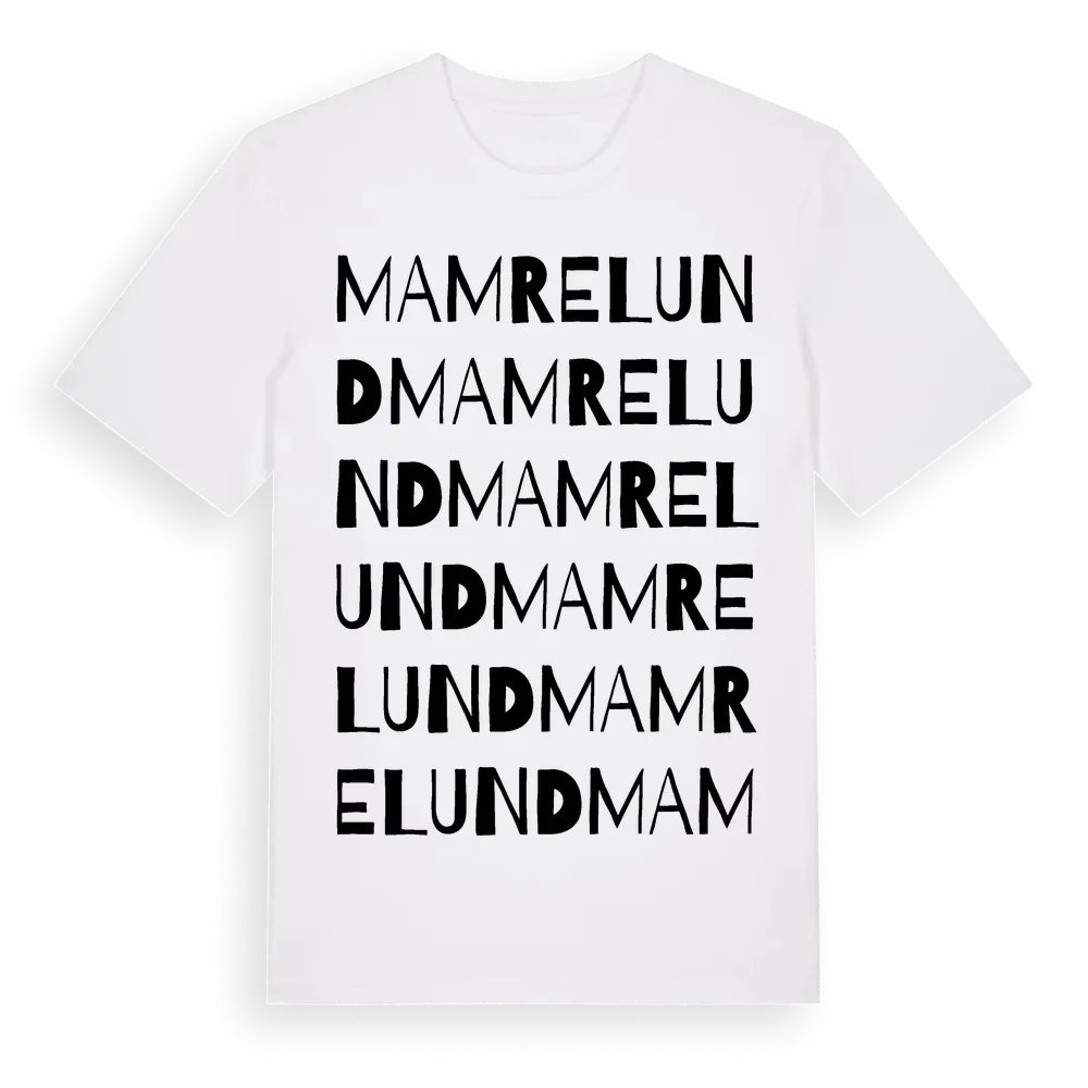 Mamrelund ordlek t-shirt är inspirerad av Mamrelund i Västmanlands län, Sverige. Tröjan är designad för dig som har en speciell koppling till platsen – oavsett om du bor här, har rötterna här eller bara älskar Mamrelund.
