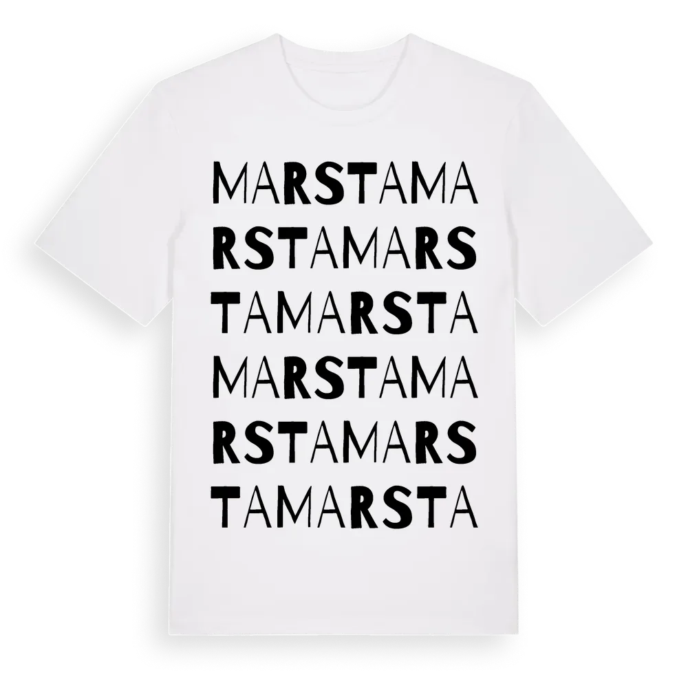 Marsta ordlek t-shirt är inspirerad av Marsta i Västmanlands län, Sverige. Tröjan är designad för dig som har en speciell koppling till platsen – oavsett om du bor här, har rötterna här eller bara älskar Marsta.