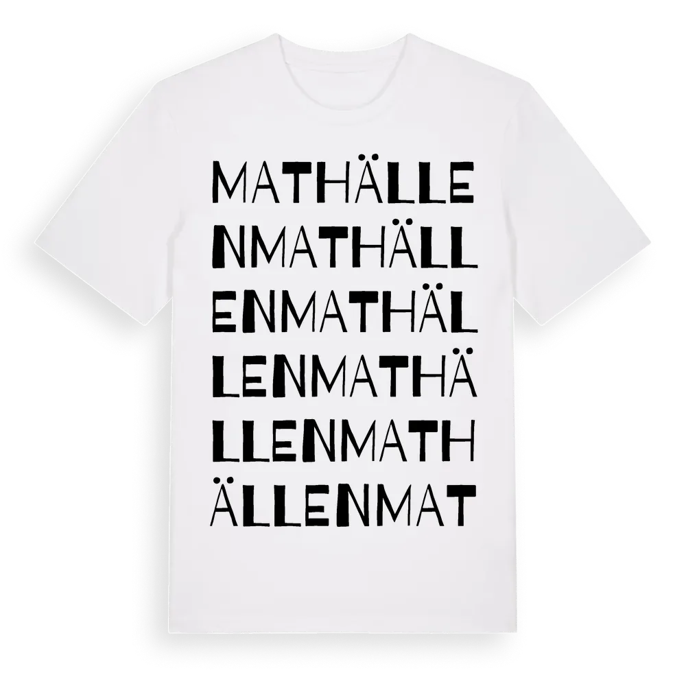 Mathällen ordlek t-shirt är inspirerad av Mathällen i Västmanlands län, Sverige. Tröjan är designad för dig som har en speciell koppling till platsen – oavsett om du bor här, har rötterna här eller bara älskar Mathällen.