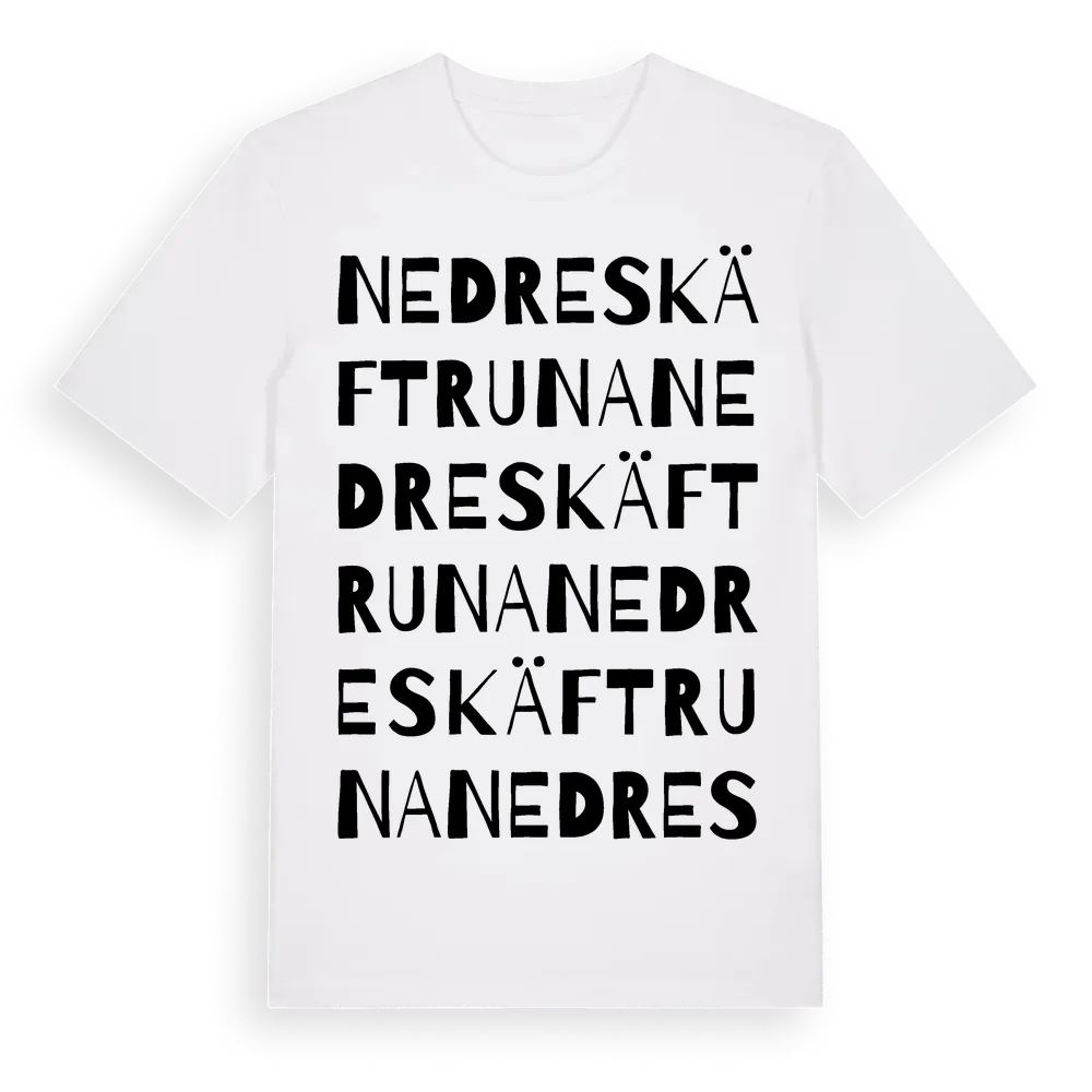 Nedre Skäftruna ordlek t-shirt är inspirerad av byn Nedre Skäftruna i Västmanlands län, Sverige. Tröjan är designad för dig som har en speciell koppling till platsen – oavsett om du bor här, har rötterna här eller bara älskar Nedre Skäftruna.