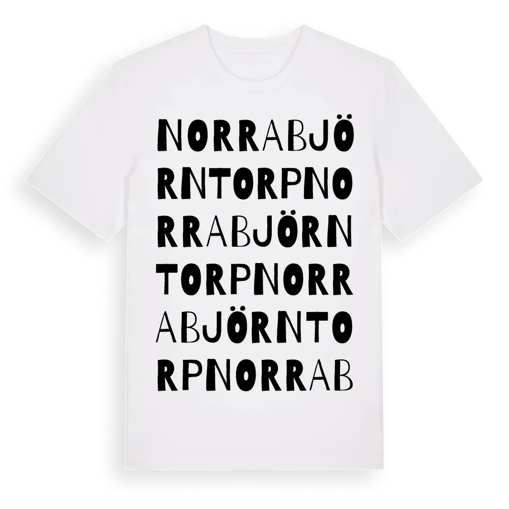 Norra Björntorp ordlek t-shirt är inspirerad av Norra Björntorp i Västmanlands län, Sverige. Tröjan är designad för dig som har en speciell koppling till platsen – oavsett om du bor här, har rötterna här eller bara älskar Norra Björntorp.