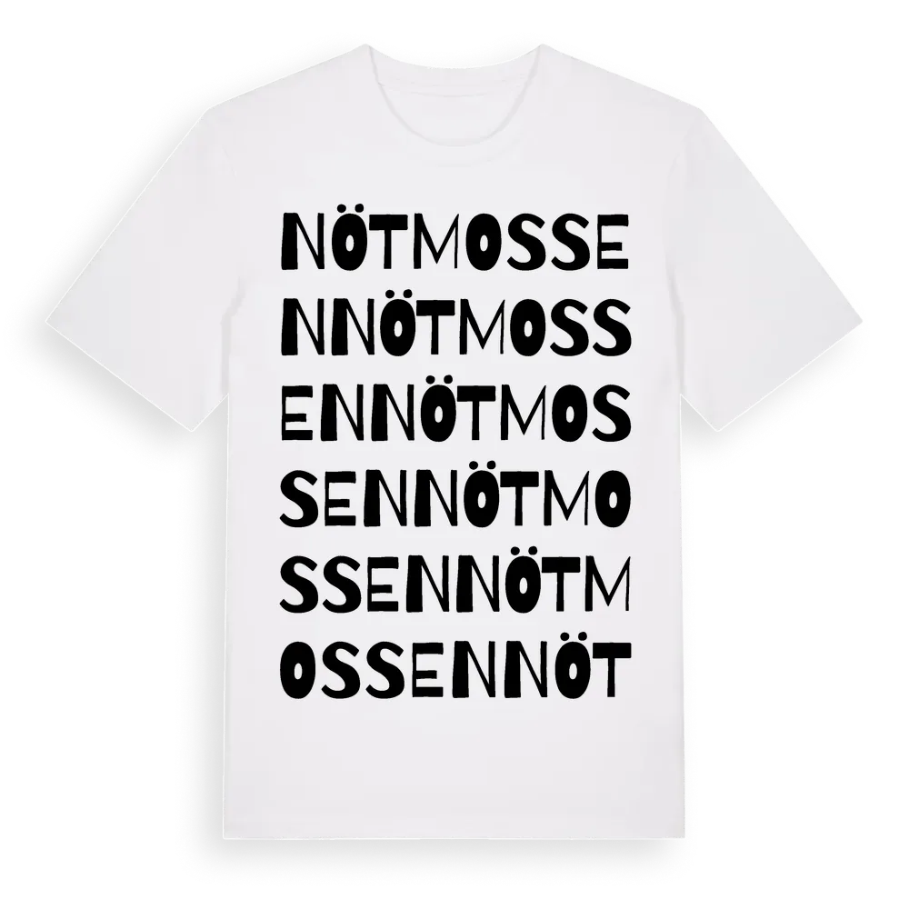 En ordlek byggd på Nötmossens namn. Subtilt och klurig – ett motiv som bara de som verkligen känner platsen fullt ut förstår. Premium bomull, unisex – från Nötmossen i Västmanlands län.