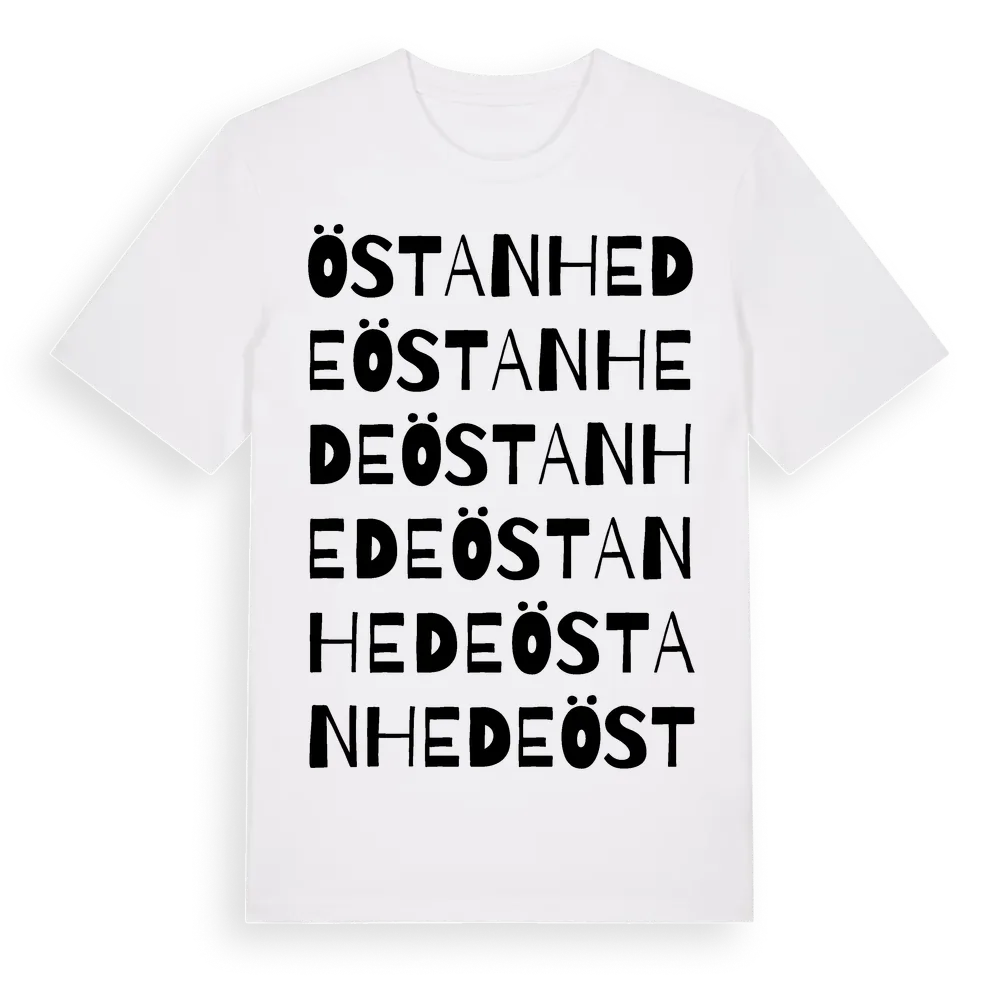 Östanhede ordlek t-shirt är inspirerad av Östanhede i Västmanlands län, Sverige. Tröjan är designad för dig som har en speciell koppling till platsen – oavsett om du bor här, har rötterna här eller bara älskar Östanhede.