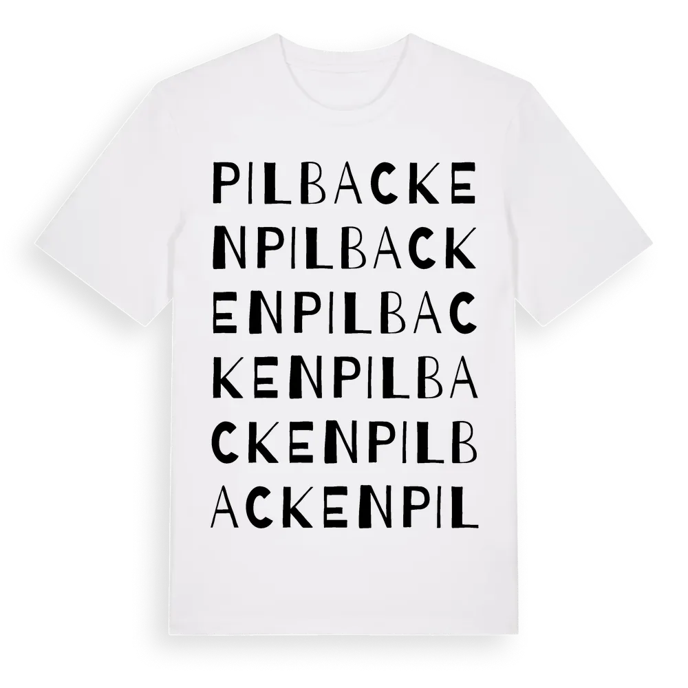 Pilbacken ordlek t-shirt är inspirerad av byn Pilbacken i Västmanlands län, Sverige. Tröjan är designad för dig som har en speciell koppling till platsen – oavsett om du bor här, har rötterna här eller bara älskar Pilbacken.
